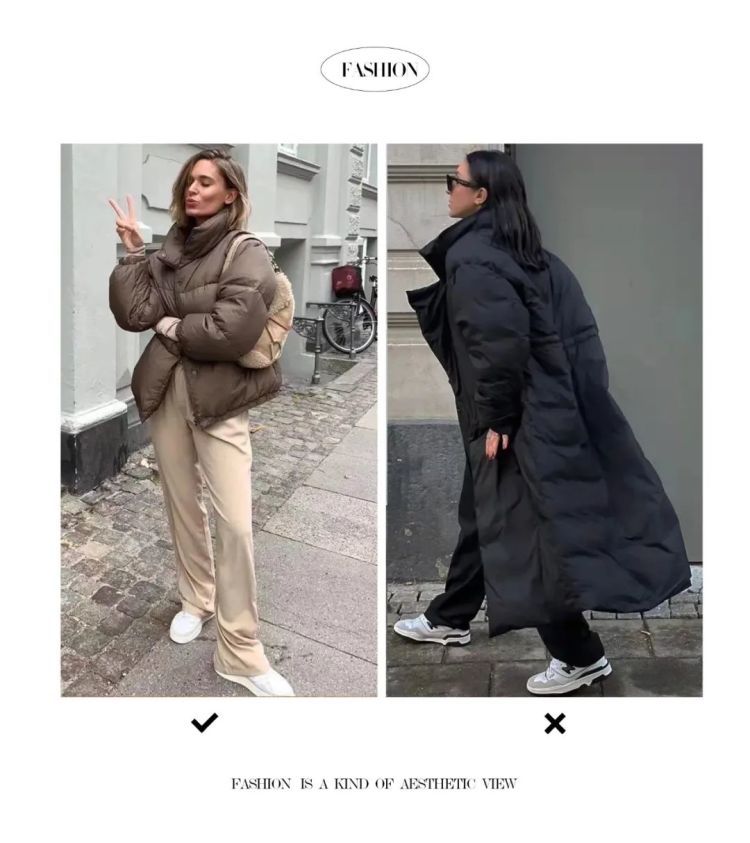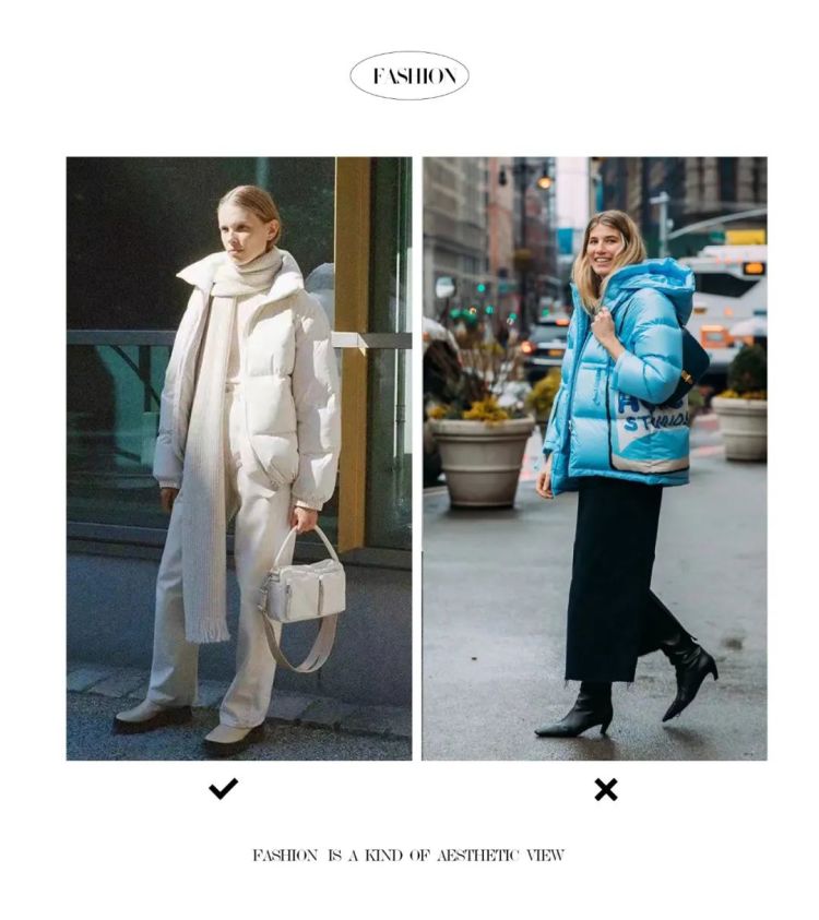 看到这里或者有人就说了:羽绒服本来就臃肿,再搭配宽松的阔腿裤不是更显胖吗?上宽下宽的组合,确实会有一定的显胖风险,所以阔腿裤的板型也不能过于宽松。