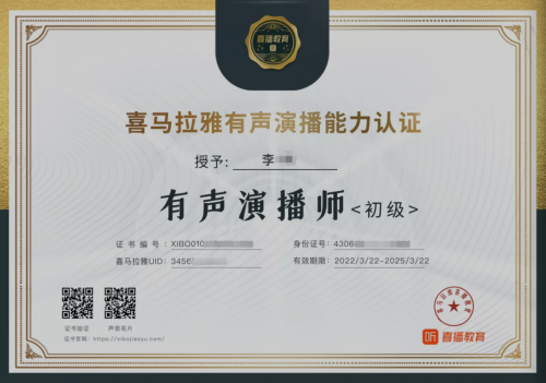 据了解,该资格证书面向喜播教育所有有声培训正式学员,并会逐步开放全市场的有声演播从业者进行申报与资格认证。学员学习结业时,将根据其专业能力进行全面考核,通过后予以颁发职业资格能力认证,分为初级、中级、高级三个等级,证书采用实名认证体系,学员可通过扫描证书上的验证码,或登录喜马拉雅喜播教育官网随时查询验证。此外,证书上还收纳了有声主播学员的声音名片,可扫码收听其声音演播能力效果。