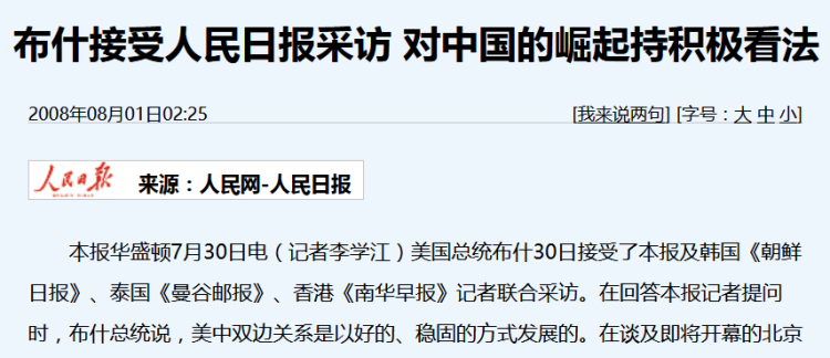 2008年6月,当时,北京正在紧锣密鼓地筹备奥运会,当小布什总统流露出席北京奥运开幕式的意愿时,却遭到美国国会和右翼舆论的反对,而他是否出席北京奥运会开幕式将影响到其他西方领导人的相关决定。 有鉴于此,笔者当时作为人民日报驻美国首席记者与新华社华盛顿分社等商量,打算对布什总统做个采访。于是,由人民日报、新华社等多家中国媒体驻美首席记者联名给白宫新闻办公室发出了采访总统的申请。7月中旬,记者收到美国国务院女新闻官的电邮。邮件说,她代表白宫向记者发出采访总统的邀请,并说因为总统此行还将访问韩国、泰国,所以邀请三国记者共同采访。