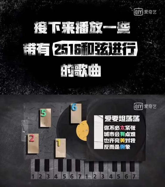 在“超级乐迷”张亚东给出“2516和弦”这个比赛题目时,节目使用了流行歌曲《爱要坦荡荡》为例讲解。主持人马东的人设偏向“音痴”,代表了大多数不懂乐理知识的观众,他的提问常常也是观众所好奇的,一问一答中同样也增加了节目对“乐队小白”的友好程度,更有效地实现了“出圈”。