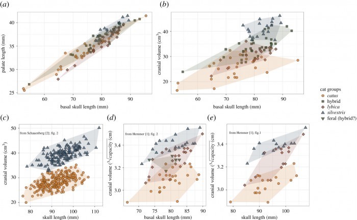 在这项研究中,研究人员比较了家猫(常用实验动物猫)和来自欧洲与非洲野猫的颅骨大小(衡量大脑尺寸的一个指标),现在这些野猫在遗传学上被证实是家猫的祖先物种。