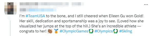 有网友说,“我从骨子里支持美国队,但当谷爱凌赢得金牌时,我仍然为她欢呼!”