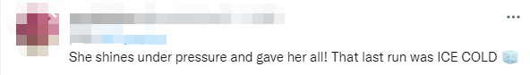 “她的技术、奉献精神和体育精神令人欣喜。 (喜欢她想象自己在山顶上跳跃的样子。) 她是一名令人难以置信的运动员,祝贺她! ”
