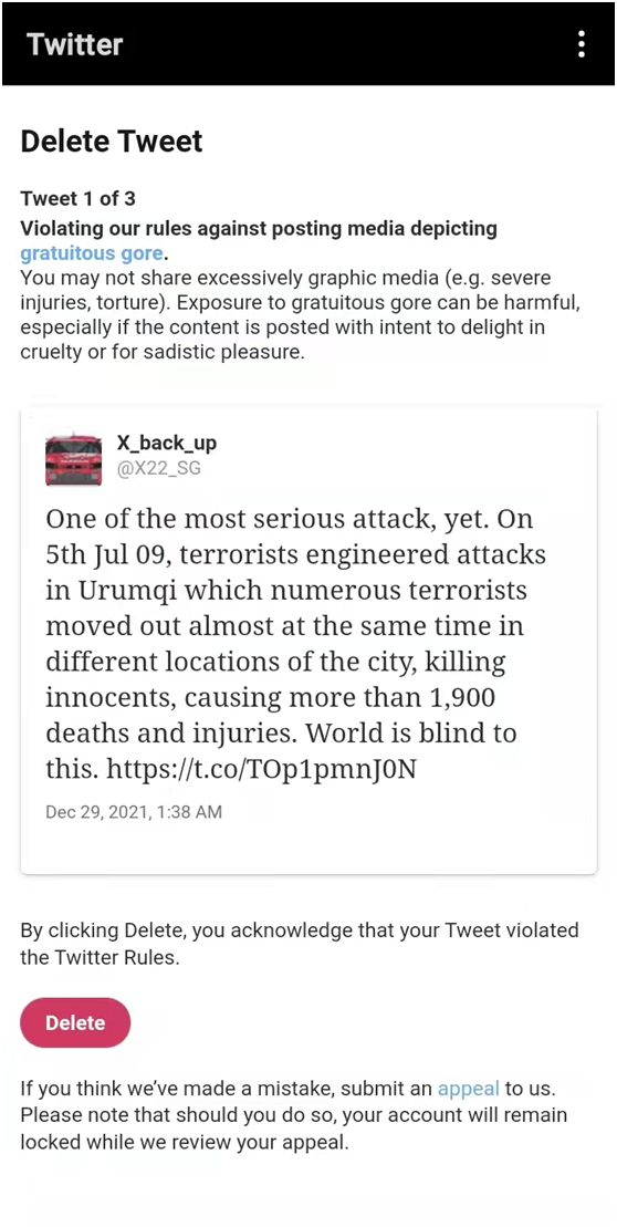 我关注了一个来自新加坡的账户,有次发布了新疆多年来遭受的恐怖袭击的视频。推特以“敏感媒体(包括写实暴力和成人内容)”为由逼其删掉推文,否则将无法正常使用账号。而即便他按照推特的要求删掉视频,账号也会被限制,无法正常显示推文。