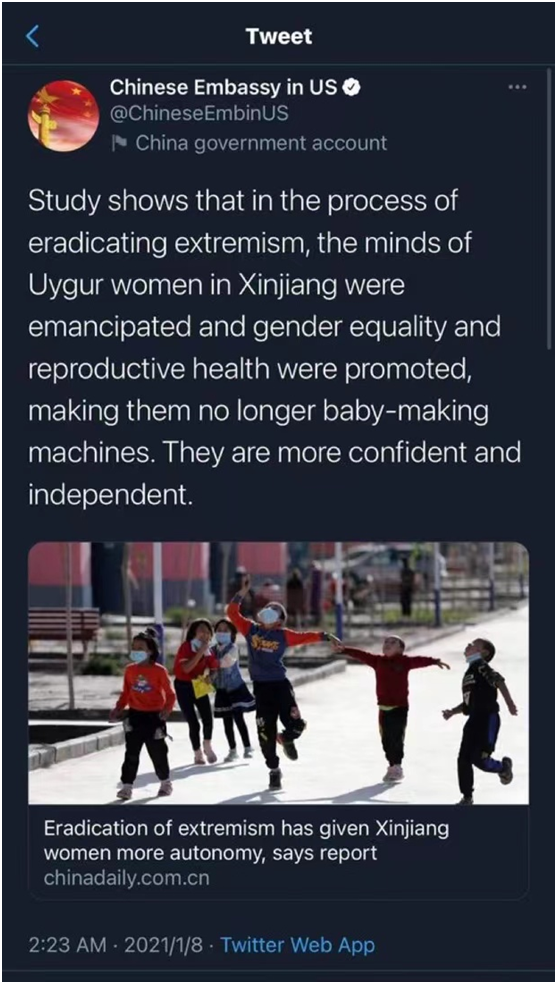 如果你有记忆,中国驻美国大使馆账号@ChineseEmbinUS就因为在推特发布了一篇中国日报的新闻“根除极端主义赋予新疆妇女更多自主权”的推文,而被禁言。驻美使馆拒绝删除该条推文,时至今日,该认证的账号仍然无法使用,页面永久停留在2021年1月9日。