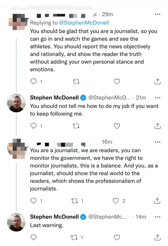 我作为一名普通网民,用不带情绪的话语向麦迪文提出建议,“作为记者,你应该客观理性地报导,让读者看到真实的新闻,而不是仅从你自己的立场和意识形态出发。”