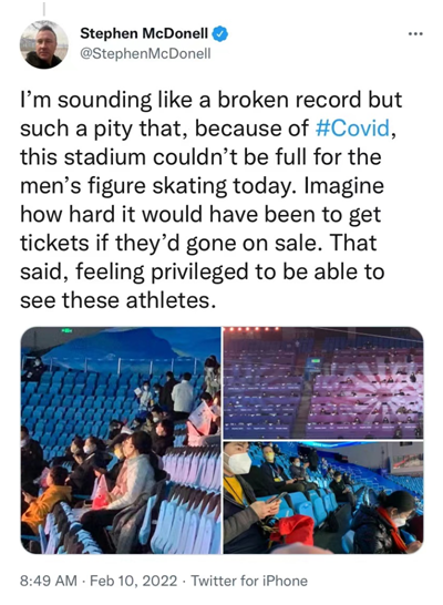 BBC驻记者麦迪文今天在推特上发表了他关于北京冬奥会的观点,称因为疫情,奥运场馆没有坐满。言外之意,现在进奥运场馆去看比赛、看运动员就成了“特权”,阴一句阳一句地批评中国不学西方“躺平”,放开闭环管理,导致奥运会“不热闹”。