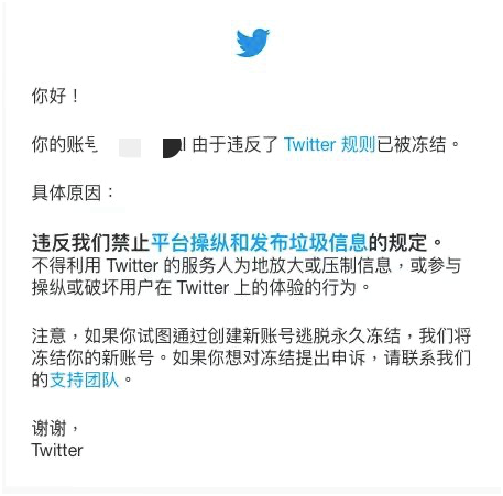 是的,本人上一个账号就是被推特以上述理由永久冻结的。