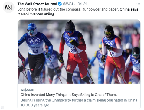 《华尔街日报》文章一开头便流露出不怀好意的阴阳怪气:“指南针、火药、纸和……滑雪?中国正利用冬奥会进一步表明,滑雪起源于1万年前的中国,并宣传新疆是这项运动的发源地和未来。”随即文章便用西方话术扣上帽子:“新疆是中国的一部分,通常是政治冲突的代名词。”