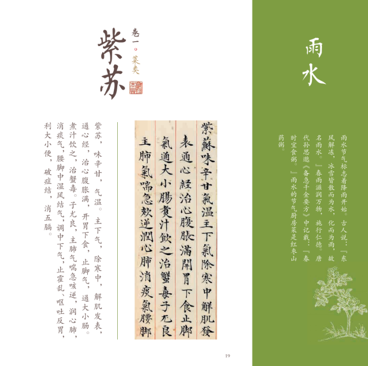 《食物本草图谱》则是根据国图馆藏《食物本草》改编而成的一本节气物候养生珍藏手账,全书包含24个节气,每个节气包含5种应季食物。书中推荐,雨水节气,可以采用紫苏、山药等草本食材以食疗。