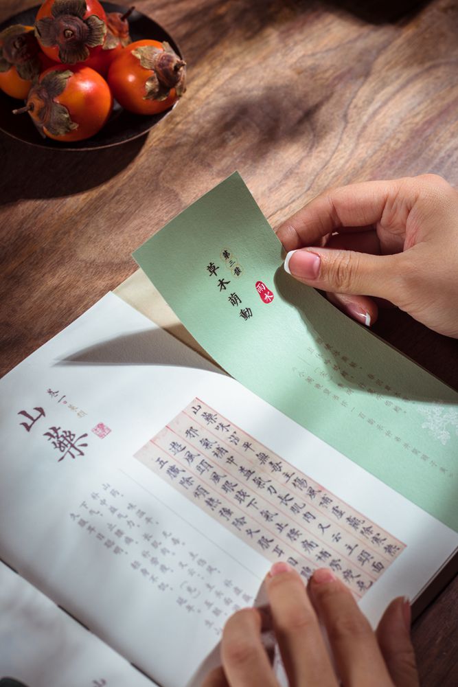 这本书除了可以作为养生指南,还有精巧的设计,每页可撕下做便签和桌面的装饰,等全部撕完使用后,就为一本装帧精美的食物本草图鉴,不仅让古籍”活“起来了,古书中的养生知识也能活用在今人的生活中。