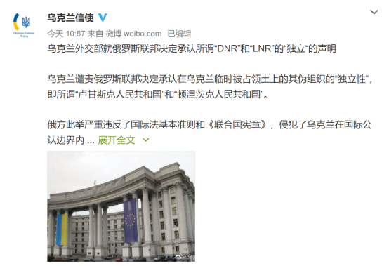 最早发出声明的是乌克兰方面。22日上午10时57分,乌克兰驻华大使馆信息中心官方微博@乌克兰信使发布“乌克兰外交部就俄罗斯联邦决定承认所谓‘DNR’和‘LNR’的‘独立’的声明”。