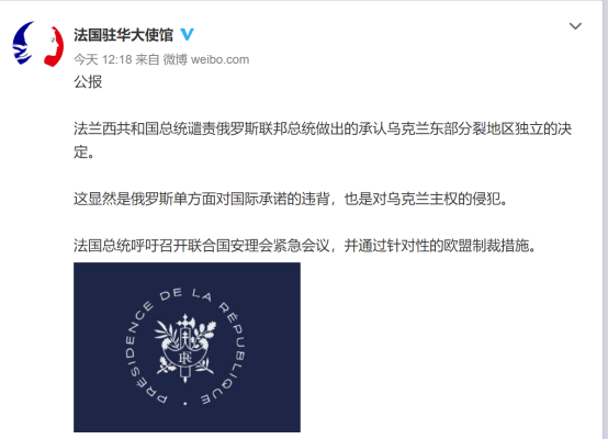 之后不久,22日12时18分,法国驻华大使馆发布公报称,法兰西共和国总统谴责俄罗斯联邦总统做出的承认乌克兰东部分裂地区独立的决定。