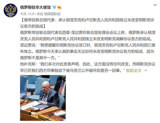 1小时10分钟后,俄罗斯驻华大使馆微博又发布俄罗斯常驻联合国代表瓦西里·涅边贾在联合国安理会会议上的发言,表示俄罗斯承认顿涅茨克人民共和国和卢甘斯克人民共和国独立未改变明斯克调解协议各方的组成。