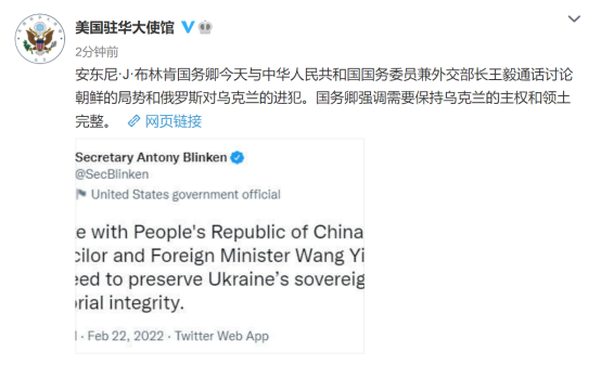 22日15时37分,美国驻华大使馆也发布了一条关于美国务卿布林肯与中国国务委员兼外交部长王毅通电话,讨论乌克兰和朝鲜半岛局势的微博。