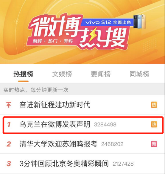 【环球网报道】俄罗斯总统普京21日晚签署命令,承认乌克兰东部的“顿涅茨克人民共和国”和“卢甘斯克人民共和国”。北京时间22日,乌克兰驻华大使馆、法国驻华大使馆、俄罗斯驻华大使馆、英国驻华使馆和美国驻华大使馆先后在微博上以中文发布声明。其中,“乌克兰在微博发声明”一度冲上微博热搜第一。