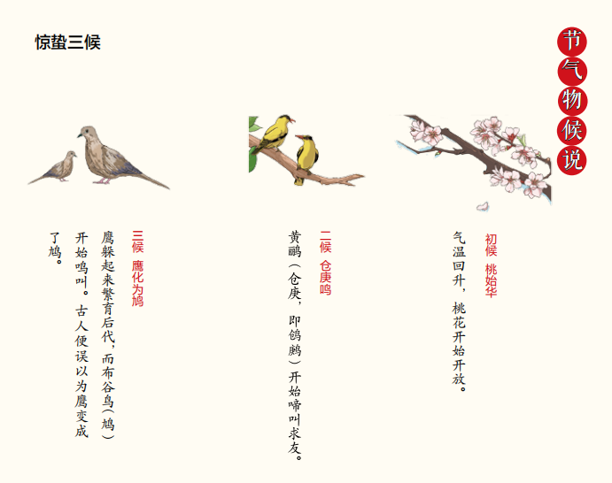 《群芳谱》载:“雨水后十五日为惊蛰,蛰虫震惊而出也。” 惊蛰分为三候:“一候桃始华,二候仓庚鸣,三候鹰化为鸠”。