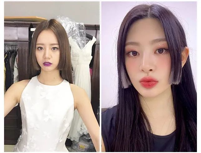 仔细观察上面两张图,其实除了发尾染最大的差距是头型,左边的李惠利头型更尖,颅顶更高,这也引出了长脸型最容易被忽略的一点:尖头的长脸不适合中分公主切。
