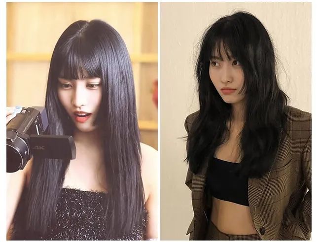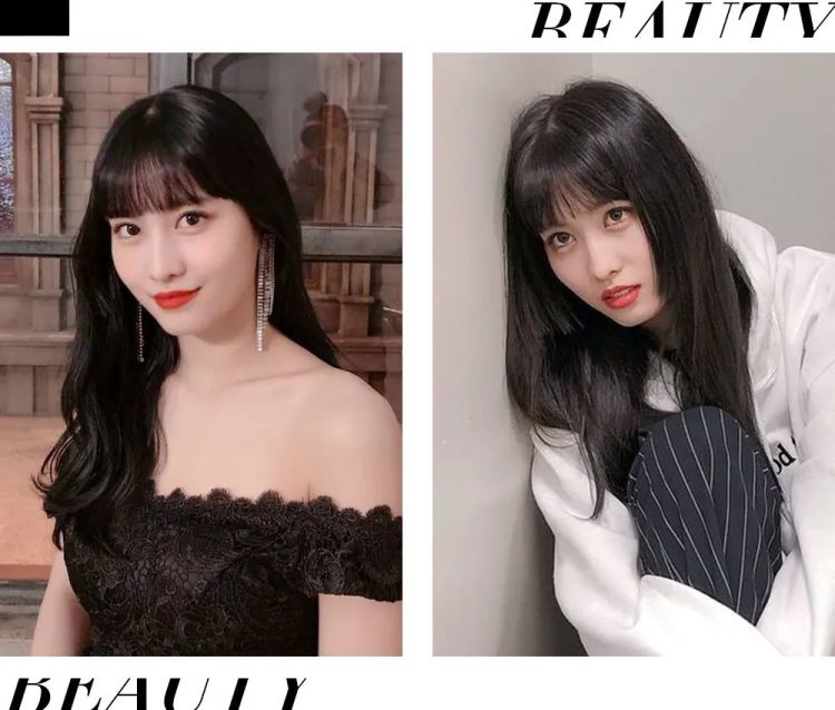 除了缩短脸长,公主切还可以遮盖颧骨。同样的空气刘海,Twice的momo在剪公主切前有颧骨外扩的问题,剪了公主切之后脸形被修饰得更加流畅。
