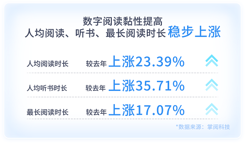 《2021年度掌阅数字阅读报告》显示,2021年度掌阅平台用户数字阅读时间分布均匀,人均阅读时长、人均听书时长、最长阅读时长较上一年度分别上涨23.39%、35.71%、17.07%,国民阅读习惯已经初步养成,数字阅读正成为推进全民阅读迭代升级的强力支撑。在第十一届书香中国·北京阅读季阅读盛典中,掌阅科技“全民阅读推广的数字化创新与应用”项目入选2021年北京市全民阅读优秀项目。