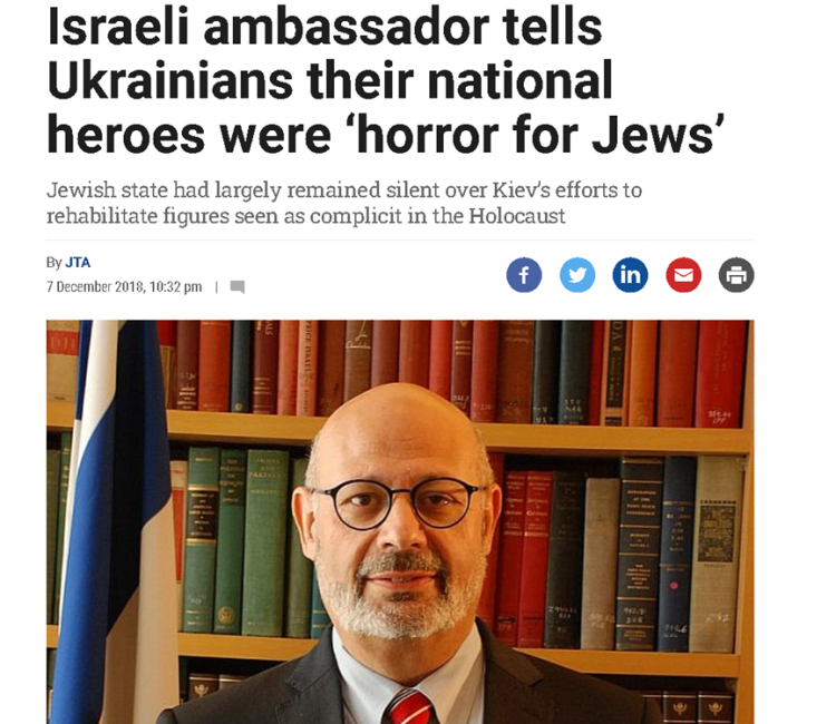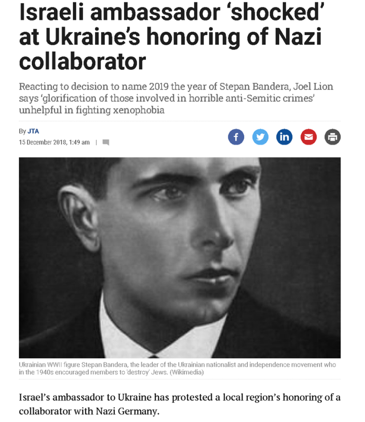 如下图所示,根据《以色列时报》的报道,仅在2018年,以色列驻乌克兰大使Joel Lion就多次抗议过乌克兰纪念班德拉和舒赫维奇的行为,称这些乌克兰的“民族英雄”是“犹太人的噩梦”。