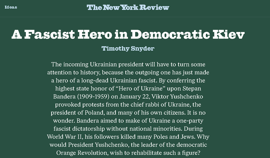 比如2010年时,被支持俄罗斯的人批为“亲美反俄”的美国耶鲁大学历史学者蒂莫西·斯奈德(Timothy Snyder)就在他一篇关于班德拉的文章中直白地表示班德拉就是一个法西斯主义者,他的政治目标就是在乌克兰建立一个独裁的法西斯政权,甚至在他于1959年被苏联克格勃的特工刺杀时,他仍然没有放弃在乌克兰建立法西斯政权的想法。