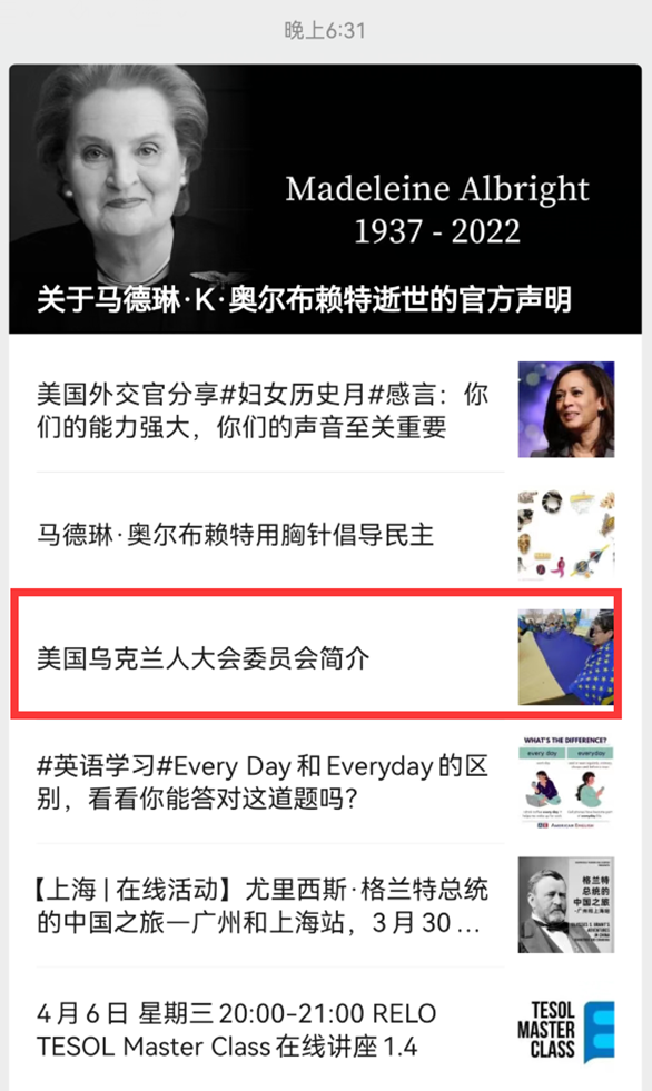 如下图所示,在3月24日晚间6时31分,美国驻华大使馆在其开设在中国微信平台的公众号上推送了一组信息,其中的第四条信息,是在给一个叫“美国乌克兰人大会委员会”(Ukrainian Congress Committee of America)的组织做宣传。