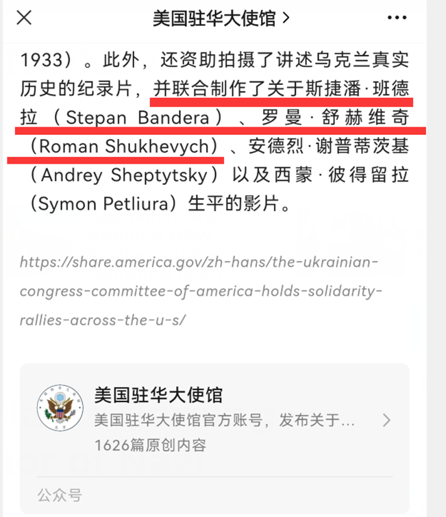 然而,有网民向耿直哥反映说,美国驻华大使馆在介绍这个美国的乌克兰人组织时,提到了这样一段让人担忧的内容,那就是该组织曾经给掏钱制作了两部讲述乌克兰历史人物斯捷潘·班德拉以及罗曼·舒赫维奇的电影。
