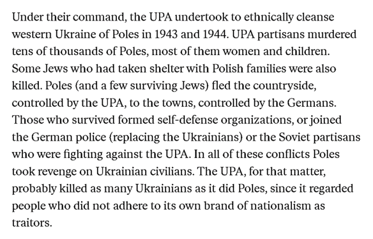 斯奈德还在这篇文章中明确表示班德拉曾经主动与德国纳粹合作。根据他的说法,尽管班德拉的行为是为了换取德国纳粹对于他建立一个独立乌克兰的支持,而且纳粹还因为后来与他在这件事上闹翻,把他也抓入了集中营,但他和他领导的乌克兰极端民族主义组织确实很认可法西斯的那套意识形态,并打着“种族净化”旗号屠杀过犹太人以及波兰平民——只因为他们的国家曾经占领过乌克兰的西部。