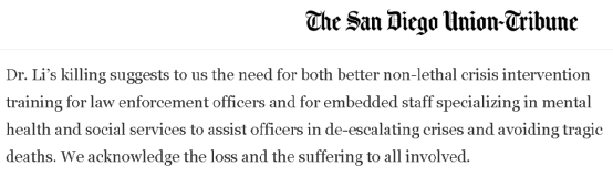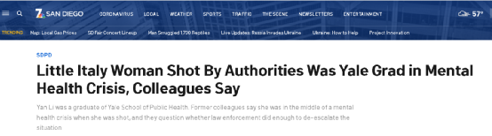 在这篇题为“警察和法警射杀了我们的同僚,他们为什么没看到她精神出了问题”的文章中,三人首先表示Li Yan是耶鲁大学公共卫生学院非常优秀的博士毕业生,很勤奋,他们对她的人生被如此暴力的终结感到痛心,并对所有在这起悲剧中受伤的人致以慰问。随后,三名学者认为应该探清此案中Li Yan袭警背后的真相,而且身为公共卫生学者,他们认为也应该从此案中总结经验教训,更好地制订政策,避免这类悲剧再发生。