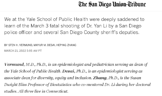 同时,Li Yan曾经就读过的耶鲁大学,于本周给当地媒体写来了一封质疑警方做法的评论文章。撰写此文的三名学者分别是Li Yan曾经就读的耶鲁大学公共卫生学院的院长Sten Vermund、副院长Mayur M. Desai,以及曾经教过Li Yan的耶鲁大学生物统计学教授张和平(Heping Zhang)。