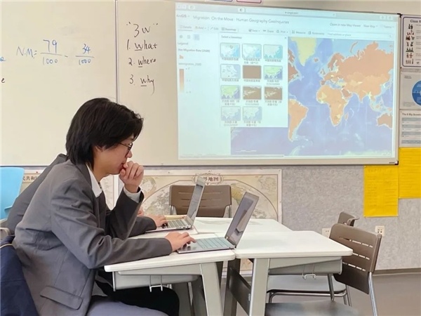 再以10年级的地理课为例,这节课的主题是“移民”。用英文讲移民,首先要让孩子了解基本的词汇,这和气候、历史、文化、地缘政治、时事热点都有着千丝万缕的联系, 同时孩子们还要学习使用 ARCGIS Online的在线平台来调取不同国家的移民数据,进行很多空间分析。