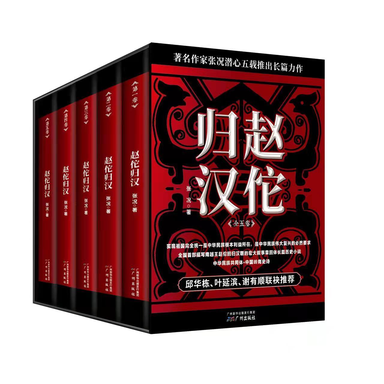 引言:《赵佗归汉》是一部长篇历史小说,五卷本,广州出版社2021年11月版。是著名作家张况披沥五载心血奉献出的又一部文学精品力作,将一个轰轰烈烈的辉煌而燃烧的时代画卷徐徐展现在我们面前。