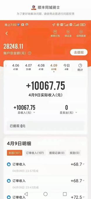 4月11日晚,顺丰同城发布一则关于网传“顺丰同城骑士收入过万”的说明称,近日,网传图片显示一顺丰同城骑士4月9日实际收入10067.75元,经后台查询后确认,该顺丰同城骑士共完成60笔同城配送订单,系企业用户下单,订单佣金计提总额达10067.75元。其中基础佣金534元,各类特殊奖励约1678元,用户打赏约7856元。也就是说,该骑士平均每单不含打赏收入为约36.9元,平均每单获得打赏约131元。
