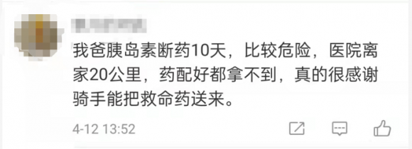 “我爸胰岛素断药10天,比较危险,医院离家20公里,药配好都拿不到,真的很感谢骑手能把救命药送来。”、“闺蜜很难配的处方药被顺丰同城骑士紧急配送”等等。