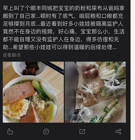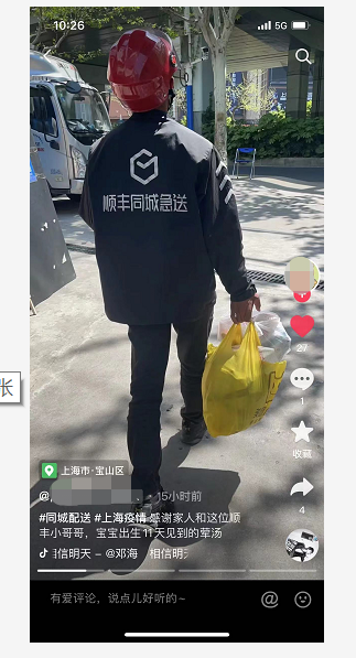 也有一些宝妈在社交平台感谢骑士为小孩紧急配送奶粉等婴儿生活必须品,也有母亲因疫情期间营养补充不足导致母乳不足,顺丰同城骑士紧急配送的生活物资使自己营养得到补充,使刚出生11天的宝宝不至于断奶。