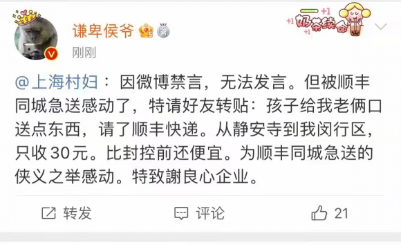 骑士的们的付出,在社交平台上也得到很多用户的赞赏,,有大V替朋友转发谢意,表示顺丰同城的骑士为老人配送生活物资,只收费30元,并未像网络传言那样,必须打赏才会有骑士接单。