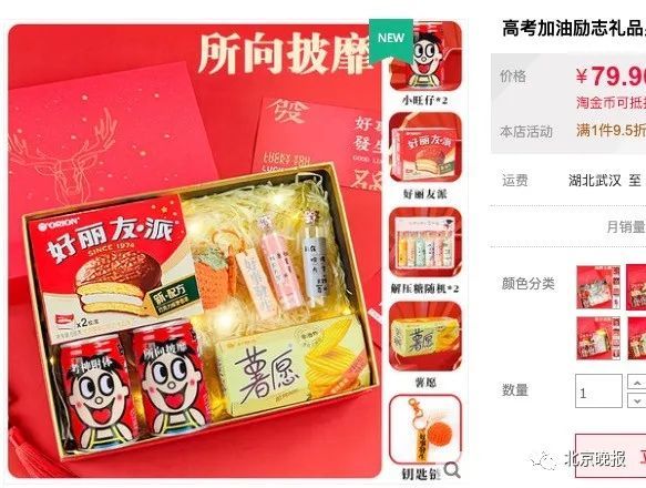 为普通商品赋予“高考”属性,有助于销量增长的同时,消费者可能还会因为想要讨个好彩头,不太计较其实际价值。记者看到,今年不少商家极具创意地推出“高考励志礼包”,将旺仔牛奶、薯愿薯片,芬达汽水等各类现成小零食放在一个盒子里重新包装出售。以一份励志礼包为例,内含两听旺仔牛奶,一盒2枚装的好丽友派,一小盒薯愿薯片,以及几枚祝福便签。组成精美礼包后售价79.9元 ,而如果分别购买,这些东西总价不会超过20元 。