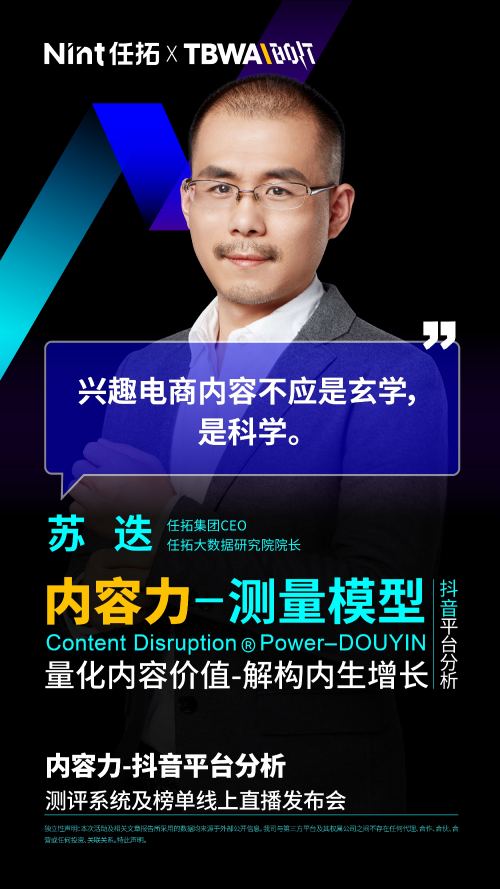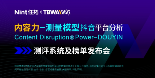 谈及此次发布的《内容力测量模型-抖音平台分析》系统及榜单线上直播发布会的地位,TBWA\BOLT策略负责人王亦昕表示,“这套模型和榜单有着大数据基因和营销策略基因,集结了Nint任拓在数字零售大数据方面的沉淀,和TBWA独有的颠覆®方法论,是数字零售领域基于抖音平台的一份‘非典型跨界’研究成果。结合模型方法论与最佳实践案例,我们试图在兴趣电商的探索之路中点亮第一盏灯,启迪更多品牌以创新思维看待‘内容’价值与效益,并与更多的探索家们共创数字零售的内生增长之道。”