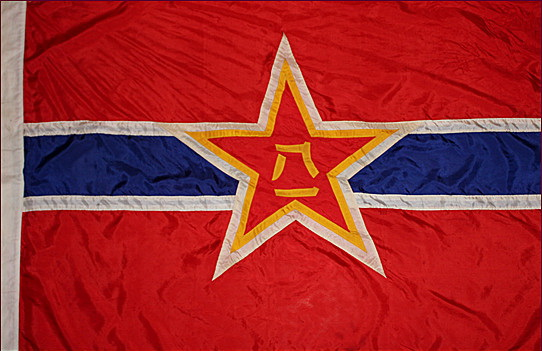 1992年9月5日,中央军事委员会发布命令,公布了中国人民解放军仪仗队使用的陆军、海军、空军军旗样式。三军军旗旗幅的上半部(占旗面的八分之五)均保持中国人民解放军军旗基本样式,正红色旗面,上有金黄色五角星和“八一”字样;下半部(占旗面的八分之三)区分军种:海军为横向的海蓝色和白色条纹相间,象征祖国蓝色海疆。 海军军旗表示,海军是中国人民解放军的组成部分,为保卫社会主义祖国的万里海疆乘风破浪,勇往直前。