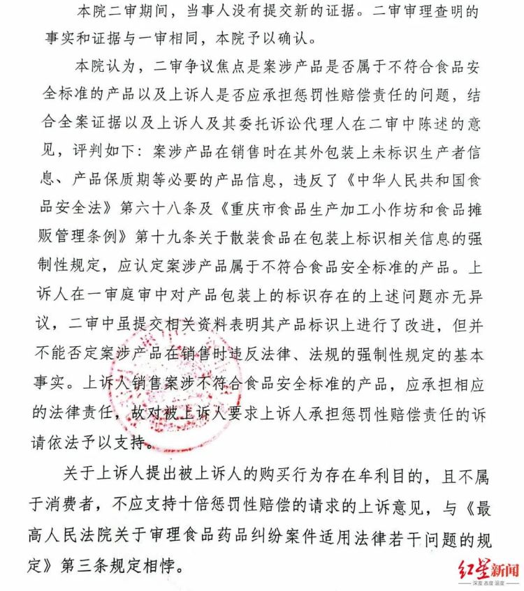极目新闻记者在二审判决书上看到,毛妈妈土特产经营部在上诉时称,那150份扣碗不是预包装食品,而是具有合法资质的散装产品,生产销售渠道合法。但法院认为,毛妈妈土特产经营部违反了《中华人民共和国食品安全法》和《重庆市食品生产加工小作坊和食品摊贩管理条例》的相关条例,涉案产品属于不符合食品安全标准的产品。 法院支持原告邵某的诉求,判毛妈妈土特产经营部退还货款并予以十倍赔偿,加上案件受理费,王女士家一共要掏5万余元。