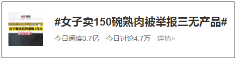 近日,“女子卖150碗熟肉被举报三无产品,法院判其退赔5万”登上热搜。