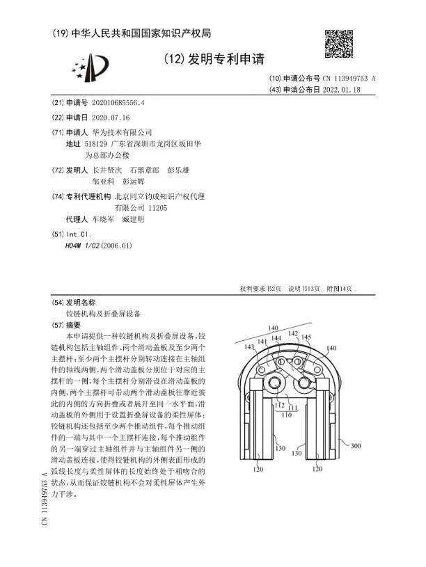 根据第二项专利的摘要内容来看,该项专利的作用是通过精巧的设计,让铰链机构闭合时形成的弧度与柔性屏折叠状态下的弧度相一致,这样无论用户如何对手机进行开合,铰链都不会对屏幕造成积压或者拉伸,从而保证了柔性屏的安全。