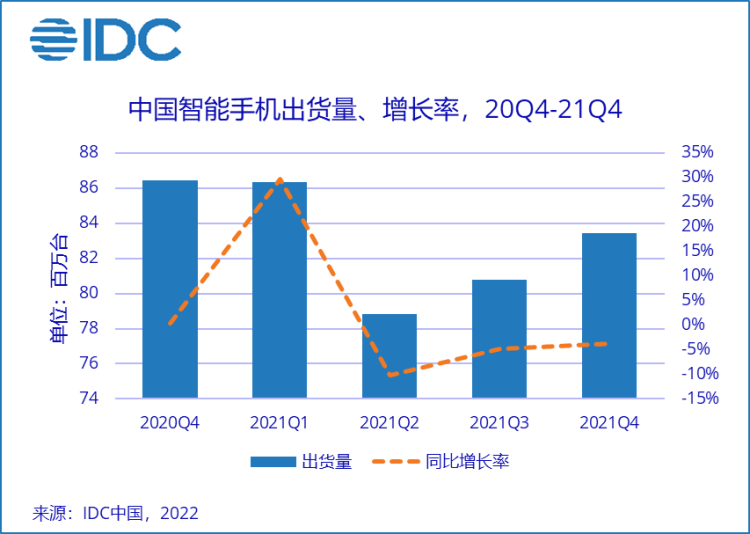随着这几大手机厂商竞相加入折叠屏手机战场,意味着新一轮折叠屏手机的技术争夺战也正式拉开帷幕。在不断更新换代中,手机从功能机实现了到智能机的跨越,而随着经济水平以及智能机渗透率的提升,中国智能手机市场也日趋饱和。根据国际数据公司(IDC)手机季度跟踪报告,2021年第四季度,中国智能手机市场出货量约8,340万台,同比下降3.5%。2021年全年中国智能手机市场出货量约3.29亿台,同比微涨1.1%。
