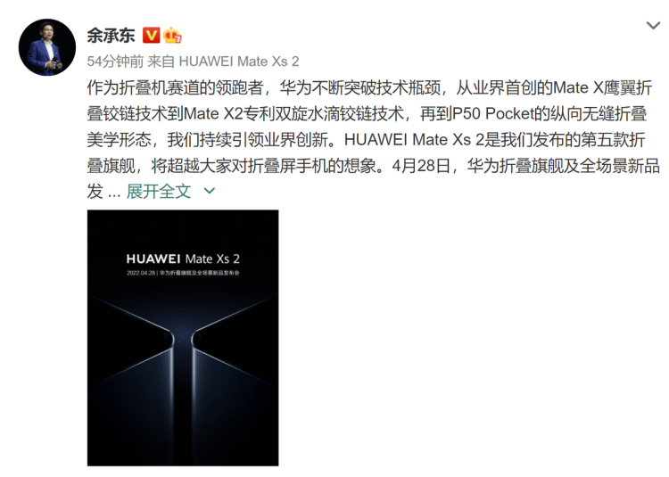 余承东表示:“作为折叠机赛道的领跑者,华为不断突破技术瓶颈,从业界首创的Mate X鹰翼折叠铰链技术到Mate X2专利双旋水滴铰链技术,再到P50 Pocket的纵向无缝折叠美学形态,我们持续引领业界创新。HUAWEI Mate Xs 2是我们发布的第五款折叠旗舰,将超越大家对折叠屏手机的想象。4月28日,华为折叠旗舰及全场景新品发布会,诚邀大家共同见证!”