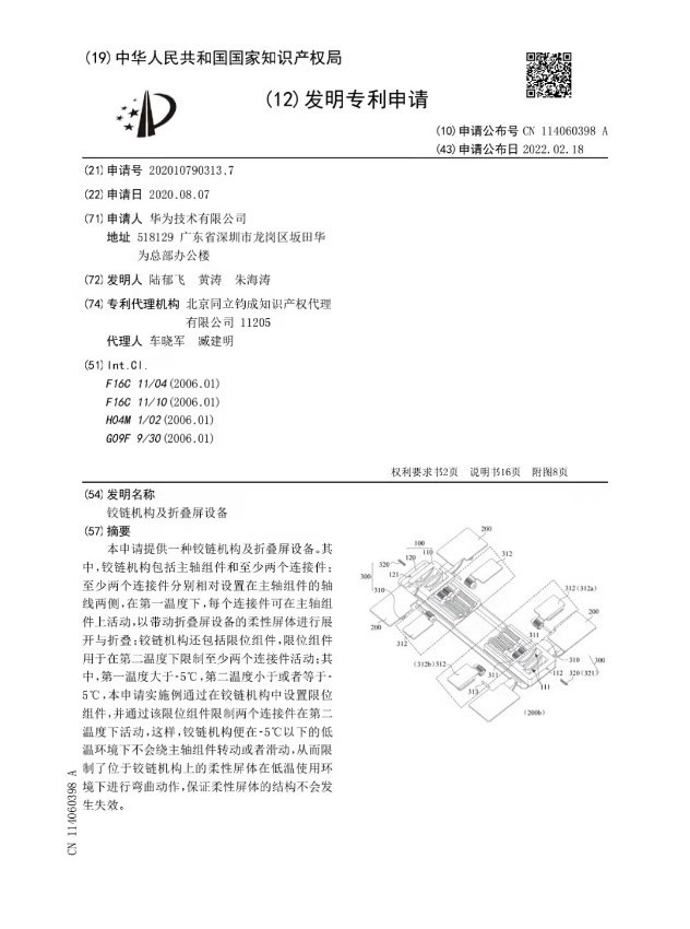 前不久,华为公开了两件有关于折叠屏铰链机构的专利也再度吸引了业界的目光。两项专利均为发明专利,方向为铰链机构和折叠屏设备。其中第一项专利的作用主要是为了防止柔性屏在低温状态下意外损坏,保证用户在冬季户外的低温天气中的使用效果。当温度高于-5℃时,连接件可以围绕主轴正常活动,而一旦温度低于-5℃,限位件就会发挥作用,限制手机的铰链机构活动,以保护用户的柔性屏不会发生由于低温引起的屏幕断裂等损坏。