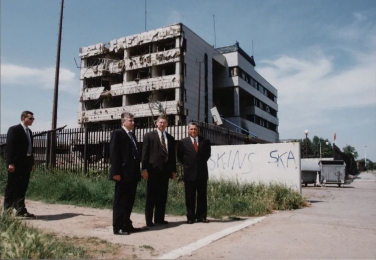 不过当时还有一个情况,政要旁边有一个争议人物:一位打遍前南各地的志愿民兵领袖——杰利科·拉兹尼亚托维奇·阿尔坎。我当时不希望他出镜,曾经一次在政要葬礼上,他就与国家高层同台被西方抓到镜头了。作为西方眼中的争议人物和犯罪分子,炸馆时他起初站在了塞总理马利扬诺维奇旁边,于是我让警方的乔维奇上校把阿尔坎挪开一点,这样我们就能有“干净”的镜头。因为我知道如果他出现在镜头里,西方媒体会故意转移话题,然后掩盖轰炸大使馆的这一罪行。