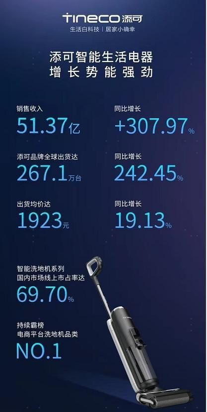 2021年3月,芙万发布2.0系列。根据科沃斯2021年年度业绩报告显示,添可销售收入51.37亿元,同比增长307.97%,全球出货量高达267.1万台,同比增长242.45%。其中,2021年智能洗地机芙万系列国内市场线上市占率达到69.7%,并持续霸榜电商平台洗地机品类NO.1。每10个家庭买洗地机,就有7个家庭选择添可芙万的奇迹仍在继续。