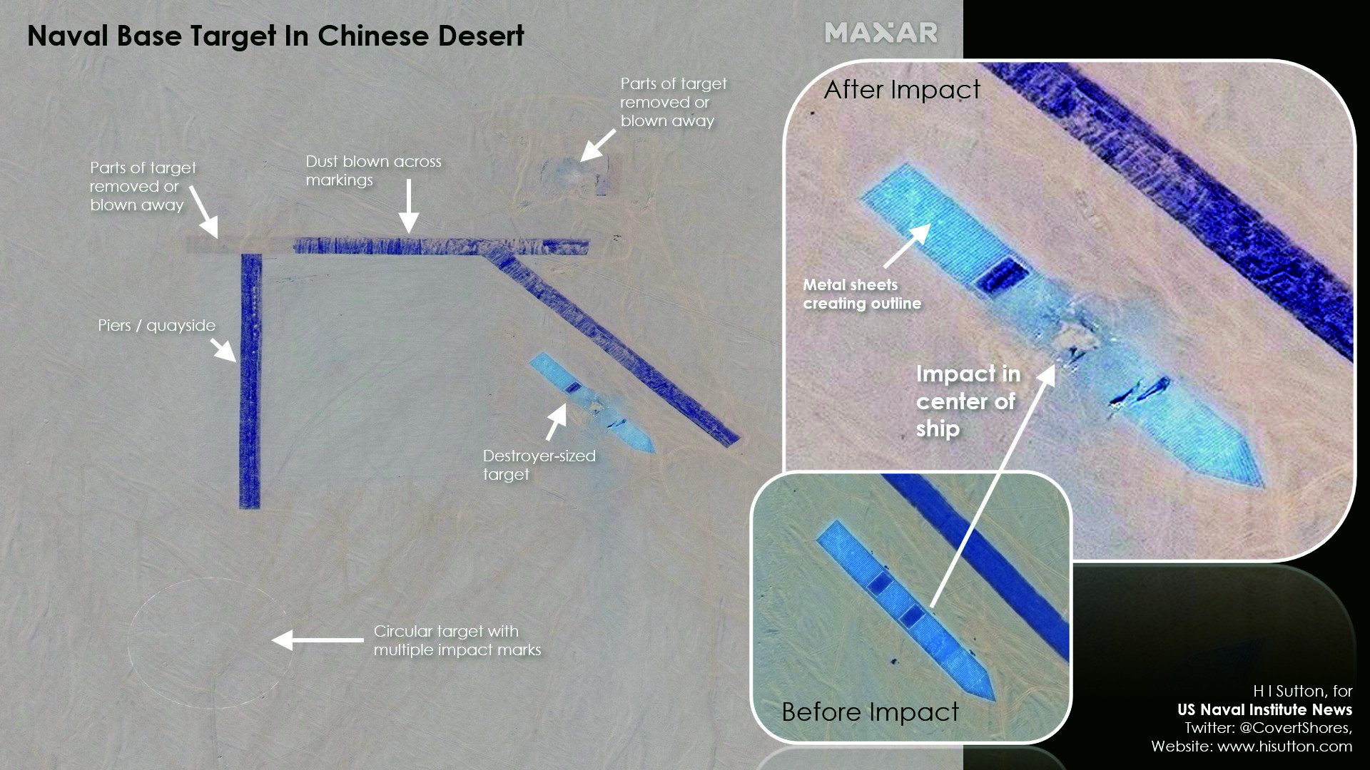 该报道称,美国Maxar公司提供的卫星照片显示,在新疆若羌地区发现的设施包括等比例的美军航母以及至少两艘“阿利·伯克”级驱逐舰轮廓的标靶,“这里的位置与解放军早先测试‘东风-21D’反舰弹道导弹的靶场相当接近”。Maxar公司的光学卫星照片显示,该靶标的形状类似完整的美国“福特”级航母轮廓,但没有舰岛、飞机起降设备等细节;而在雷达成像照片上,仍然可以清楚识别出靶标呈现出典型的航母轮廓。报道认为,该航母靶标通过专门设置的设备,同时具备光学和雷达特征,显然是精心设计的,“远不是伊朗在波斯湾设置的粗糙美军航母靶标可以比拟的”。