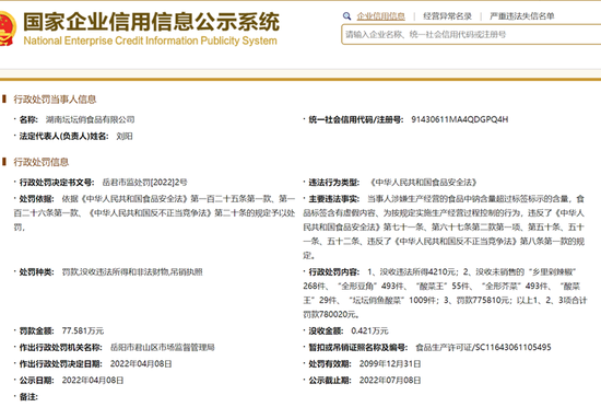 3·15晚会曝光的“土坑酸菜”涉事企业岳阳市君山区雅园酱菜食品厂、湖南坛坛俏食品有限公司分别被岳阳市君山区市场监督管理局罚款55万元和78万元。此外,岳阳市君山区雅园酱菜食品厂被提请发证机关吊销该企业食品生产许可证,目前该企业正在进行营业执照作废声明。湖南坛坛俏食品有限公司也于年4月18日被依法吊销坛坛俏食品生产许可证。